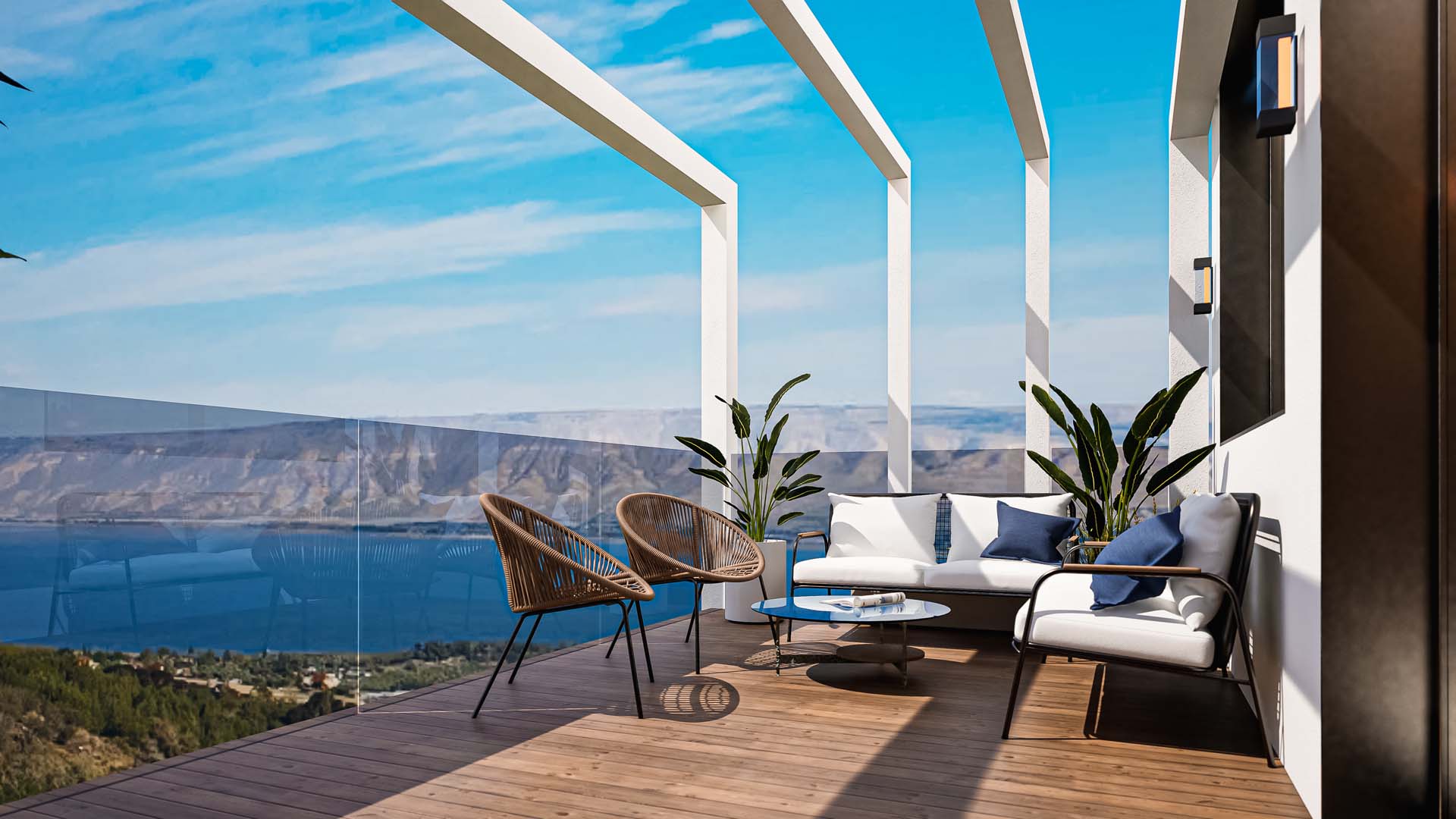 Depuis les appartements du premier étage et au-dessus, une vue s’ouvre sur la mer de Galilée et les hauteurs du Golan.